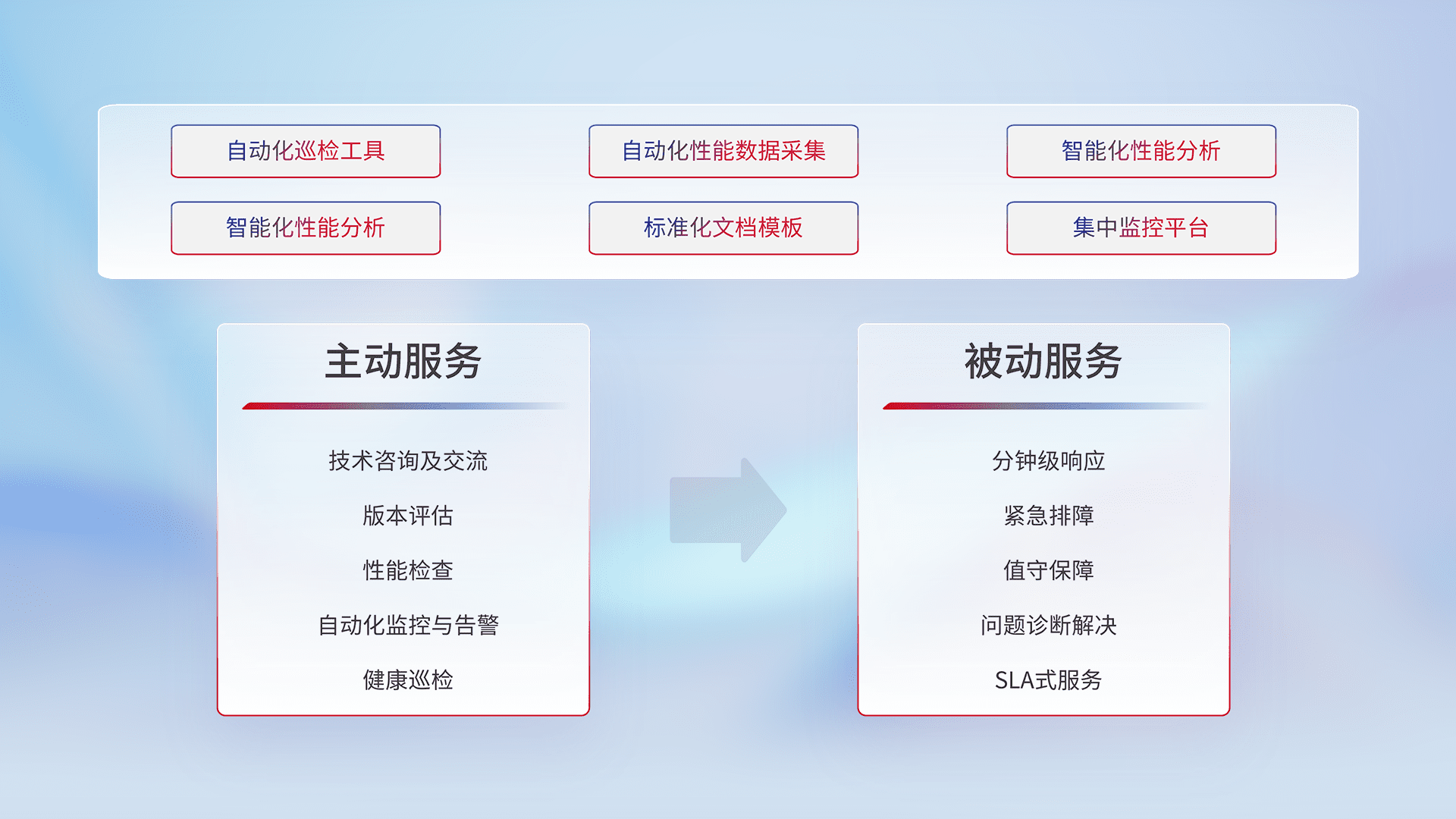 智能化工具和标准化文档,,保障服务质量,,,,提供主动服务(包含技术咨询、、、版本评估、、、、性能检查、、、、自动化监控与告警、、、、健康巡检)和被动服务包含(分钟级响应、、、、紧急排障、、值守保障、、问题诊断解决、、SLA服务)。。